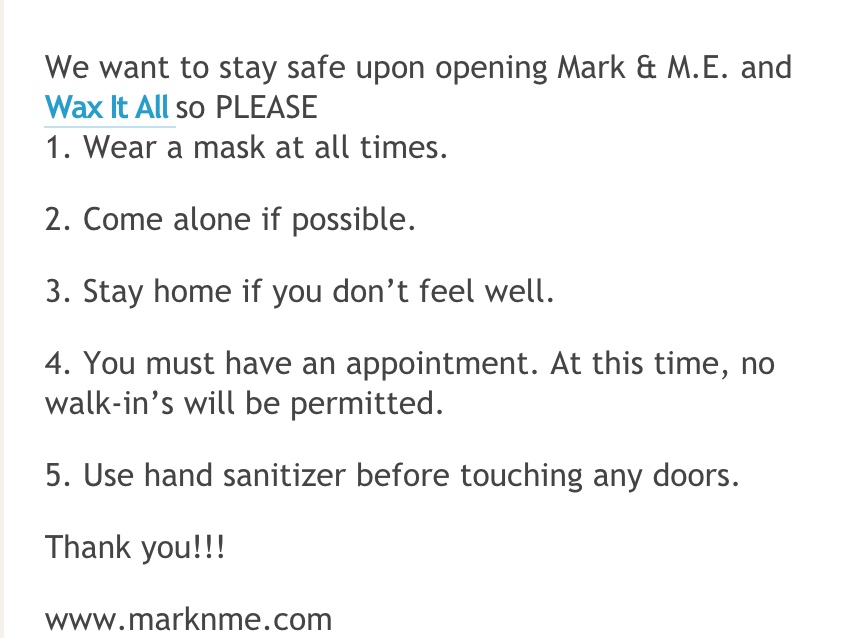 Our estheticians still don’t know if they can return to work next Friday or not. I’m an organized person who likes to plan things in advance, but I’d hate to make appointments and then have to change them again. We are praying that waxing and lashes are included in the phase 3 opening. So as soon as we know we can make your hoo-ha happy again and give you princess eyes, we will let you know!
