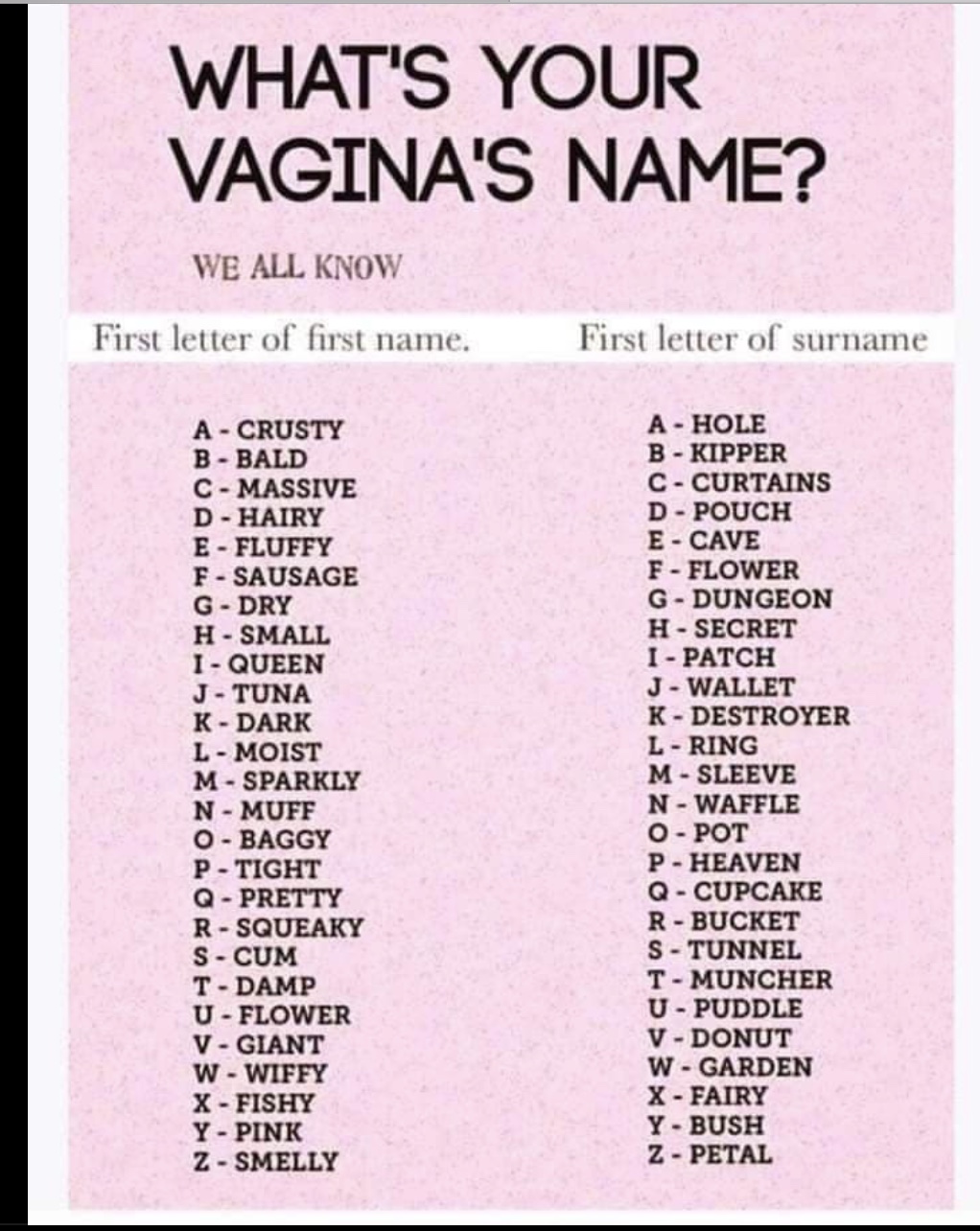 For those of you who haven’t named their vagina and have a slightly distorted sense of humor, here’s a helpful chart to give you some ideas.